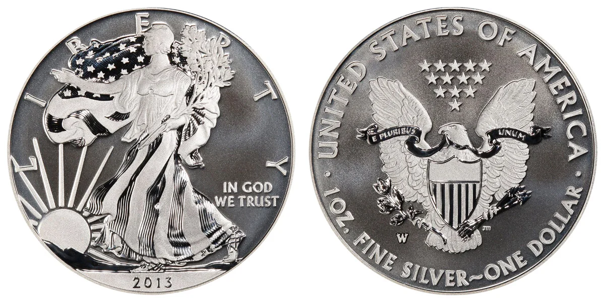 The 2013-W "Enhanced Uncirculated" American Silver Eagle was the first US coin of its kind ever made. This coin was produced as part of a 2-coin silver eagle set to commemorate the 75th anniversary of the West Point Mint. The 2-coin set also included a 2013-W Reverse Proof coin and originally sold for $139.95.