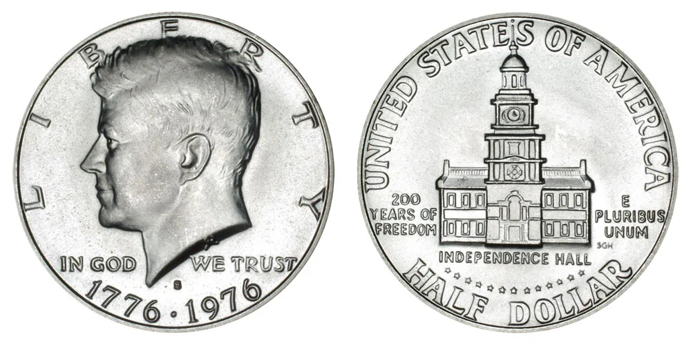 The bicentennial Kennedy Half Dollar features a 1776-1976 date on the obverse and a portrait of Philadelphia Pennsylvania's Independence Hall with the words "200 YEARS OF FREEDOM" on the reverse of the coin to celebrate the 200th anniversary of the United States of America. This coin was produced in both years of 1975 through 1976 so there were no 1975 coins.