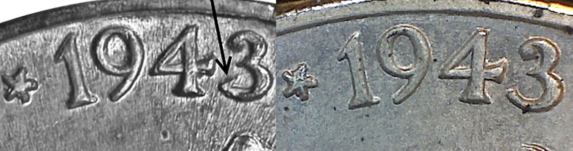 This is a doubled die Jefferson Wartime Nickel variety where the 3 is stamped over the 2. It is actually the entire date 1943 stamped over 1942 and the entire date is slightly doubled. In the left-side of the image depicted above: The 3/2 variety will have a distinctive sharp hook on the bottom end of the three which looks similar to a barb on a hook. Sometimes the 4 will appear doubled and wider as well. The right-side image depicts a normal 1943 date for comparison.