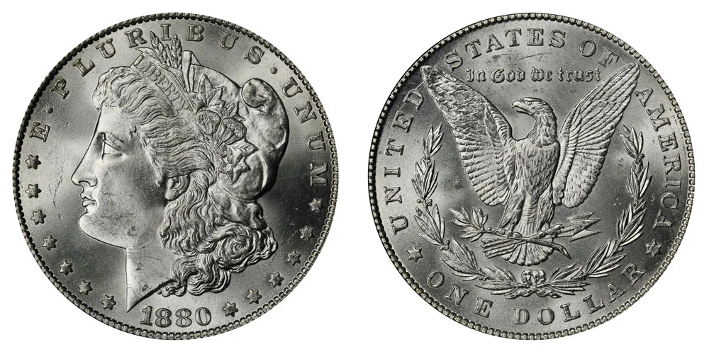 This variety of the 1880 Morgan Silver Dollar features the normal date variety with no major special features on the date. The difference between the 1880 normal date vs 1880/79 Morgan dollar varieties is depicted below in the example comparison image: