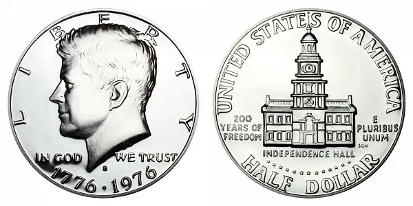 The bicentennial Kennedy Half Dollar features a 1776-1976 date on the obverse and a portrait of Philadelphia Pennsylvania's Independence Hall with the words "200 YEARS OF FREEDOM" on the reverse of the coin to celebrate the 200th anniversary of the United States of America. This coin was produced in both years of 1975 through 1976 so there were no 1975 coins. All clad coins produced from the San Francisco Mint were struck as proof coins and bear the "S" mint mark.