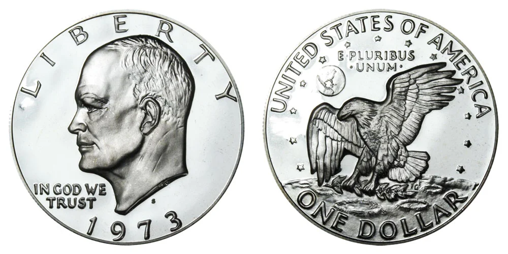 There are two major version of the 1973-S Eisenhower Dollar - both of them have a copper-clad composition. Most of the coins are mirror-like proof dollars as depicted above.