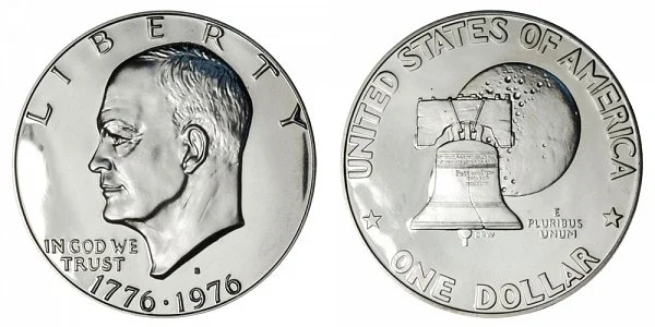 This is the Type 1 1976 S Bicentennial Eisenhower Dollar Proof in Copper-Clad composition. This coin features a 1776-1976 date on the obverse and a portrait of the Liberty Bell in front of the Moon to celebrate the 200th anniversary of the United States of America and President Dwight D. Eisenhower's work in starting the US Space Program which led to the Apollo 11 Moon landings. This coin was produced in both years of 1975 through 1976 so there were no 1975 coins.