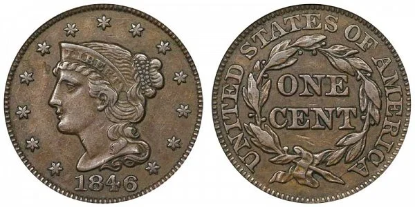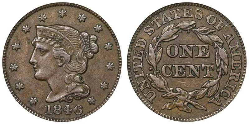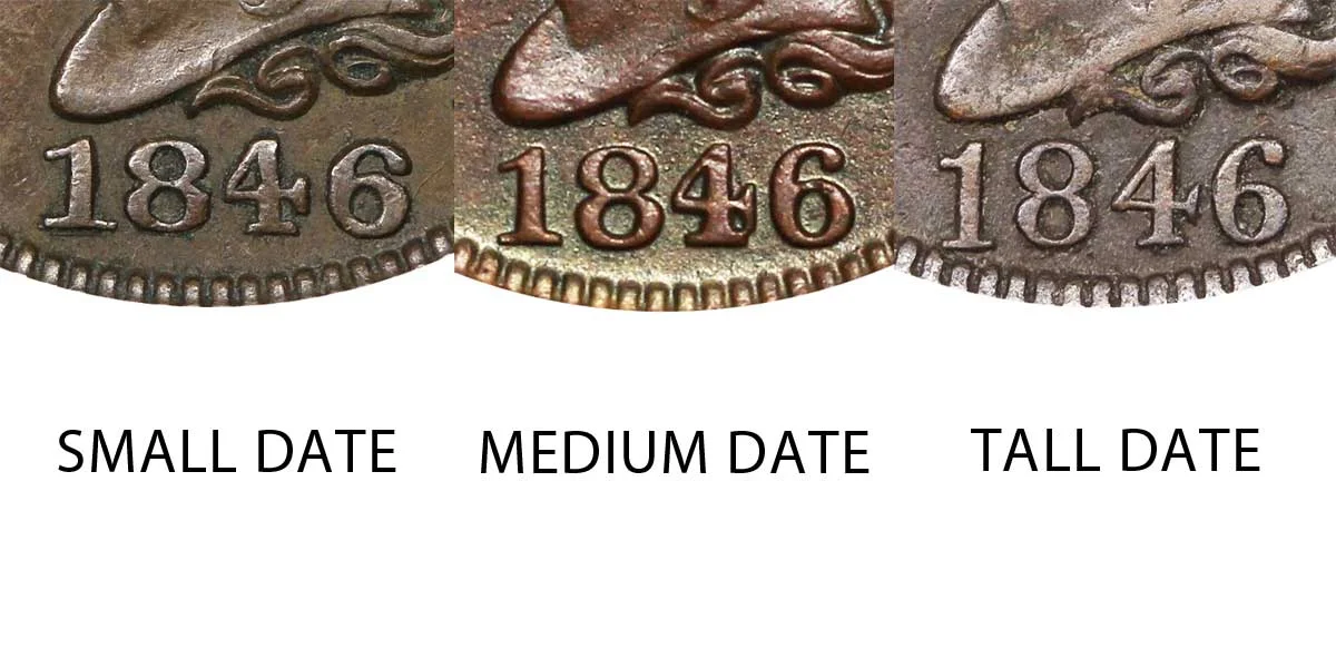 One major variety is the 1846 Braided Hair Large Cent (Penny) with the Small date style. This variety features the smallest of the dates. The difference between the Small Date vs Medium Date vs Tall Date is depicted below in the example comparison of the coin varieties: