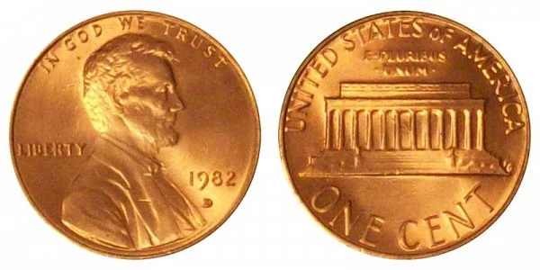 Depicted above is the 97.5% zinc composite 1982 D Small Date Lincoln Memorial Cent (Penny).