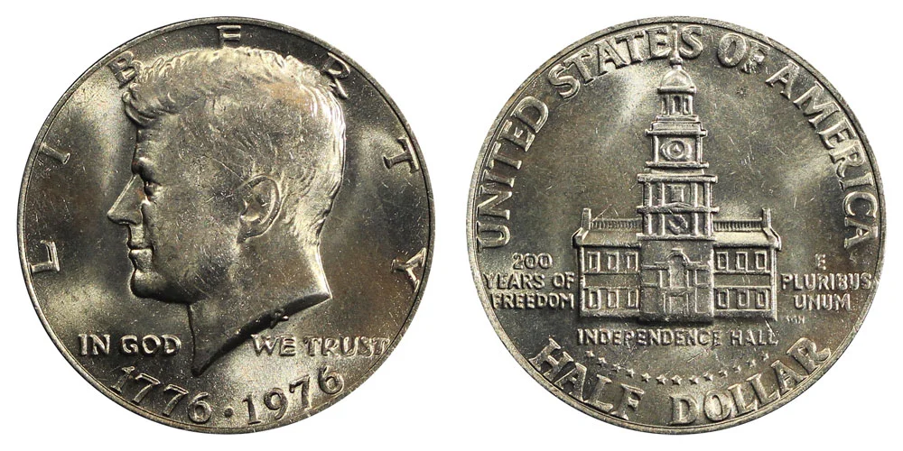 The bicentennial Kennedy Half Dollar features a 1776-1976 date on the obverse and a portrait of Philadelphia Pennsylvania's Independence Hall with the words "200 YEARS OF FREEDOM" on the reverse of the coin to celebrate the 200th anniversary of the United States of America. This coin was produced in both years of 1975 through 1976 so there were no 1975 coins.