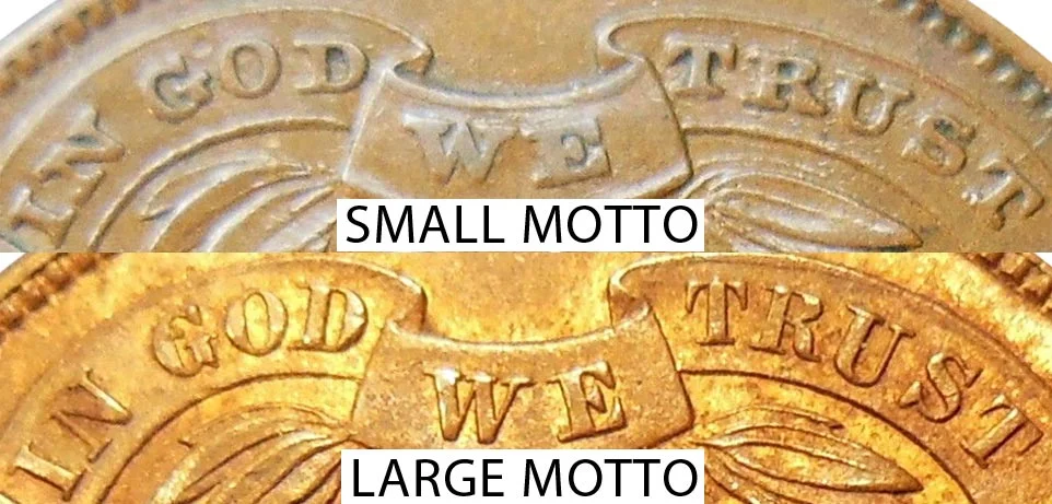 The 1864 Two Cent Piece had two major varieties. The one shown above is the "Large Motto" variety where the motto of the words "IN GOD WE TRUST" contained larger and taller letters than the "Small Motto" variety. Below is a comparison example image of the 1864 small motto vs large motto two cent piece: