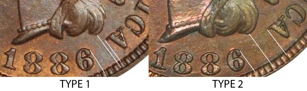 The difference between the type 1 vs type 2 1886 Indian head cent is a slight style change particularly on the obverse of the coin. The type 1 style was the earlier one which is best identified by noticing the last "A" in "AMERICA" on the obverse of the coin. The leading "A" is closer to the date and lines up with the Indian head's lock of hair. The type 2 version was the newer style where the "A" appears further away from the date in the counter-clockwise direction. The difference between the two is depicted in the example image below. Please note the differences in width between the white lines: