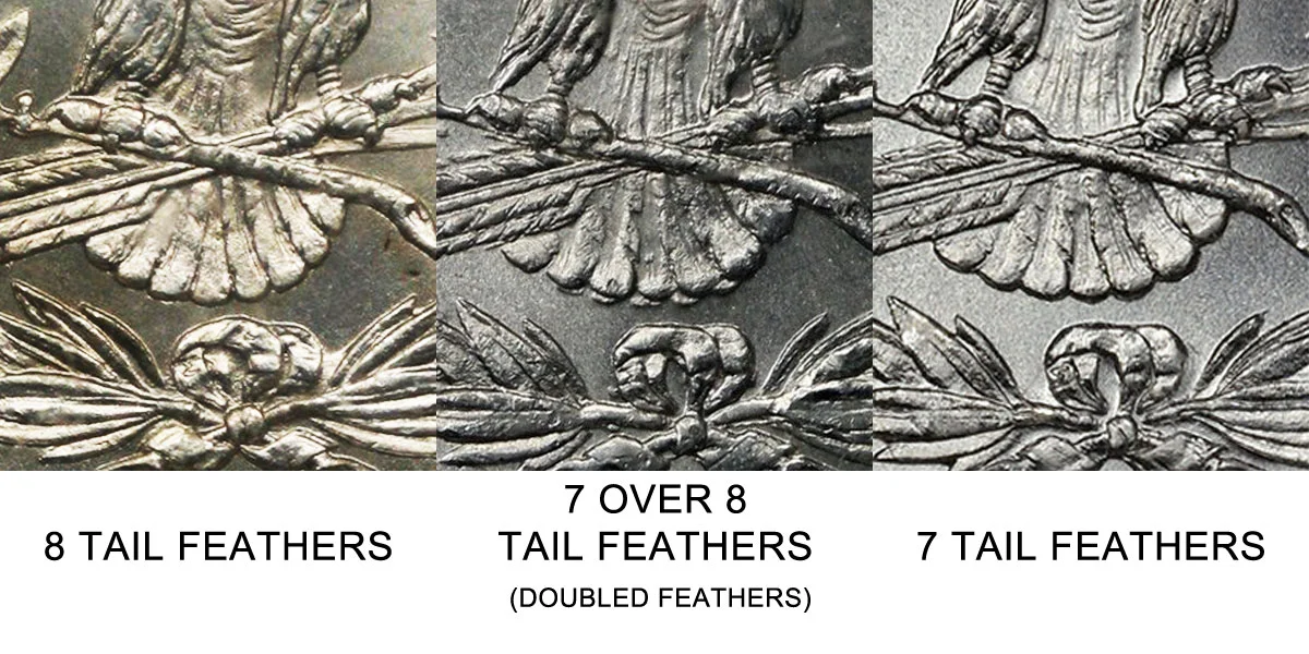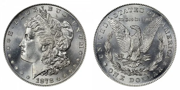 One major variety of the 1878 Morgan Silver Dollar features 7 Tail Feathers and also features the reverse design of 1878. The difference between the 7 Tail Feathers vs 8 Tail Feathers is depicted below in the example comparison image: