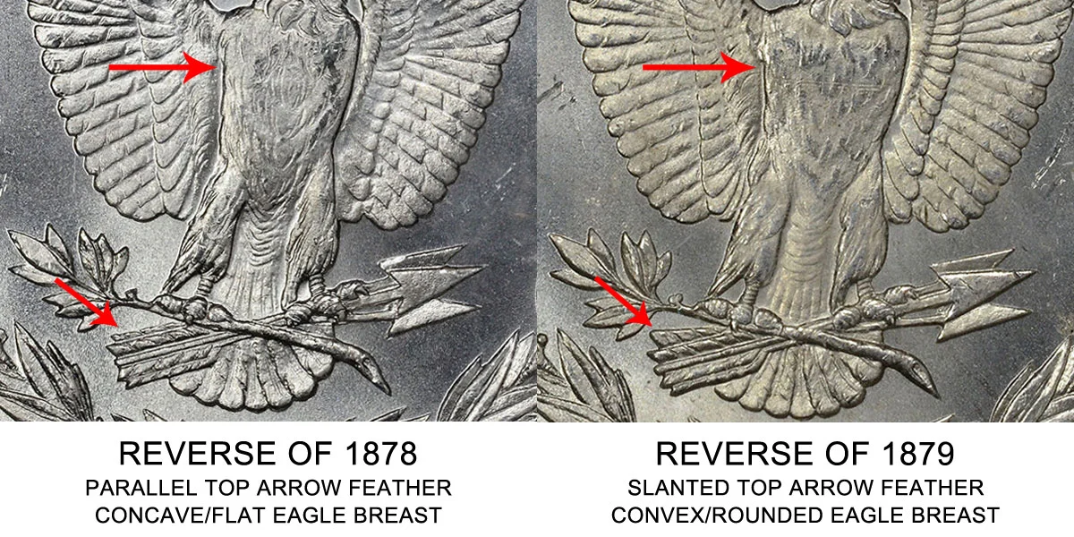 The later reverse of 1879 variety was changed to give the eagle a rounder and more convex breast appearance that looked more natural. Again the easiest way to identify the reverse of 1879 is to also look at the arrow feathers. Unlike the reverse of 1878 - the reverse of 1879 features a prominently slanted top feather on the arrow. The difference between the Reverse of 1878 vs Reverse of 1879 Morgan Silver Dollar is depicted below in the example comparison image with the features depicted by the arrows:
