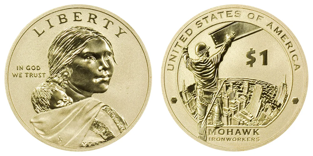 The US West Point Mint produced a special 2015-W Sacagawea Dollar with an Enhanced Uncirculated Finish. This coin was part of a currency set which included the golden dollar coin along with a 2013 $1 bill - with only 90000 sets produced. The Federal Reserve Note was printed in New York features a serial number that begins with "911" to honor the Mohawk Ironworkers recovery efforts after the World Trade Center collapse in 2001. This coin features the Mohawk Ironworkers design on the reverse and the "W" mintmark on the edge of the coin.