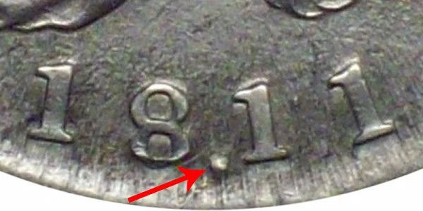 This variety is an 1811/10 Capped Bust Half Dollar and features an overdate error. An 1811 date was actually struck over an 1810 date which resulted in what looks like a dot or period in the middle of the date as depicted by the arrow in the example image above. The end result was a date that looked like 18.11 - the dot in the middle was not by design but is part of the underlying date!