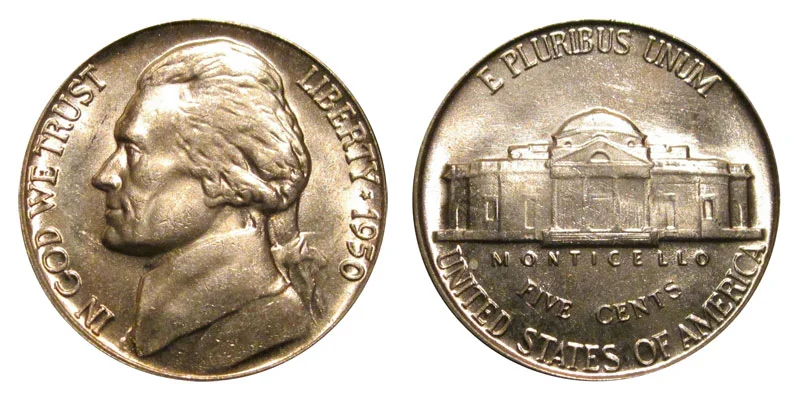 USA Coin Book Estimated Value of 1950 Jefferson Nickel is Worth $2.50 to $19 or more in Uncirculated (MS+) Mint Condition. Proof coins can be worth $92 or more. Click here to Learn How to use Coin Price Charts . Also, click here to Learn About Grading Coins . The Melt Value shown below is how Valuable the Coin's Metal is Worth (bare minimum value of coin). Click here to see the Melt Value of every US Coin .