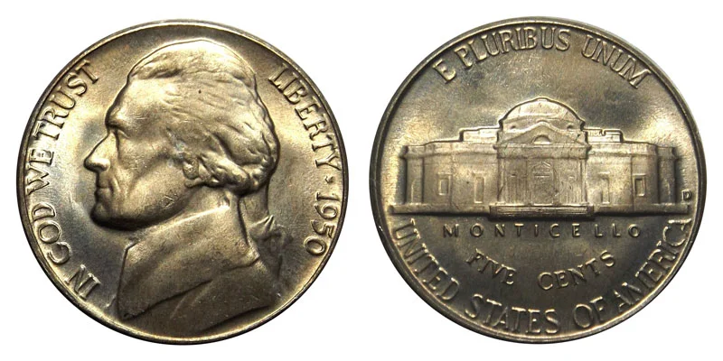 USA Coin Book Estimated Value of 1950-D Jefferson Nickel is Worth $19 to $30 or more in Uncirculated (MS+) Mint Condition. Click here to Learn How to use Coin Price Charts . Also, click here to Learn About Grading Coins . The Melt Value shown below is how Valuable the Coin's Metal is Worth (bare minimum value of coin). Click here to see the Melt Value of every US Coin .