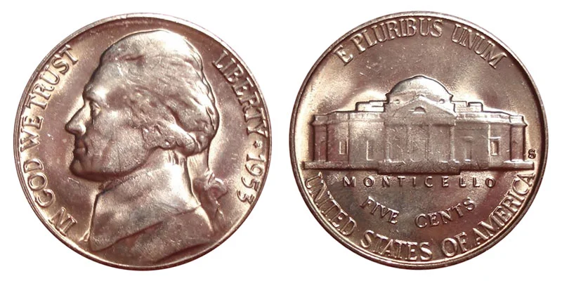 USA Coin Book Estimated Value of 1953-S Jefferson Nickel is Worth $1.56 to $30 or more in Uncirculated (MS+) Mint Condition. Click here to Learn How to use Coin Price Charts . Also, click here to Learn About Grading Coins . The Melt Value shown below is how Valuable the Coin's Metal is Worth (bare minimum value of coin). Click here to see the Melt Value of every US Coin .