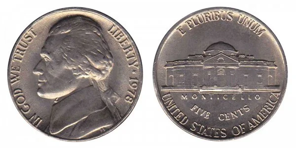 USA Coin Book Estimated Value of 1978 Jefferson Nickel is Worth $0.30 to $3.62 or more in Uncirculated (MS+) Mint Condition. Click here to Learn How to use Coin Price Charts . Also, click here to Learn About Grading Coins . The Melt Value shown below is how Valuable the Coin's Metal is Worth (bare minimum value of coin). Click here to see the Melt Value of every US Coin .