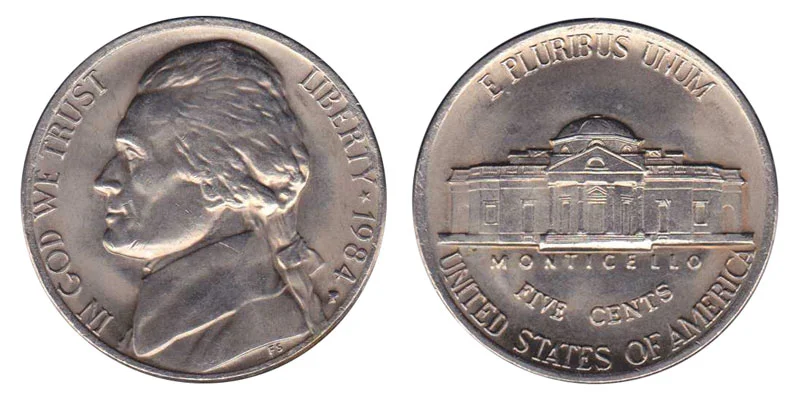 USA Coin Book Estimated Value of 1984-P Jefferson Nickel is Worth $1.24 to $3.62 or more in Uncirculated (MS+) Mint Condition. Click here to Learn How to use Coin Price Charts . Also, click here to Learn About Grading Coins . The Melt Value shown below is how Valuable the Coin's Metal is Worth (bare minimum value of coin). Click here to see the Melt Value of every US Coin .