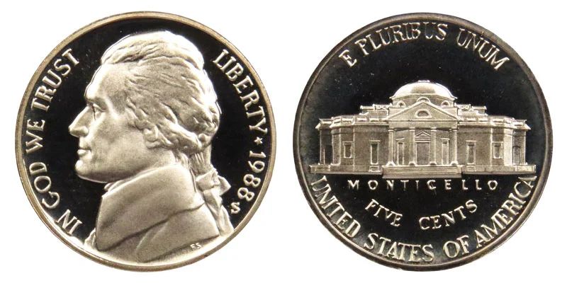 What This Coin Looks Like (Obverse, Reverse, Mint Mark Location, Special Features, etc.): 1988 S Jefferson Nickels were struck only as Proof coins.