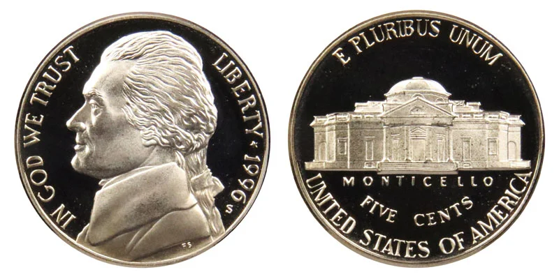 What This Coin Looks Like (Obverse, Reverse, Mint Mark Location, Special Features, etc.): 1996 S Jefferson Nickels were struck only as Proof coins.