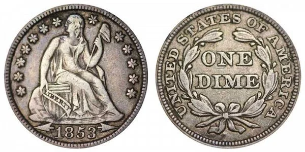 USA Coin Book Estimated Value of 1853 Seated Liberty Dime is Worth $31 in Average Condition and can be Worth $412 to $795 or more in Uncirculated (MS+) Mint Condition. Proof Coins can be Worth $24,606 or more. Click here to Learn How to use Coin Price Charts . Also, click here to Learn About Grading Coins . The Melt Value shown below is how Valuable the Coin's Metal is Worth (bare minimum value of coin). Click here to see the Melt Value of every US Coin .