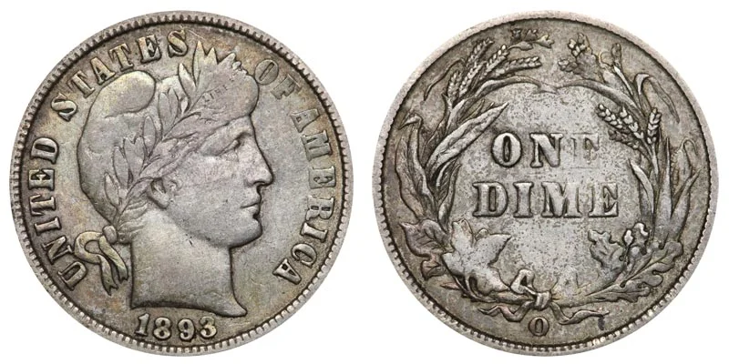USA Coin Book Estimated Value of 1893-O Barber Dime is Worth $66 in Average Condition and can be Worth $412 to $726 or more in Uncirculated (MS+) Mint Condition. Click here to Learn How to use Coin Price Charts . Also, click here to Learn About Grading Coins . The Melt Value shown below is how Valuable the Coin's Metal is Worth (bare minimum value of coin). Click here to see the Melt Value of every US Coin .
