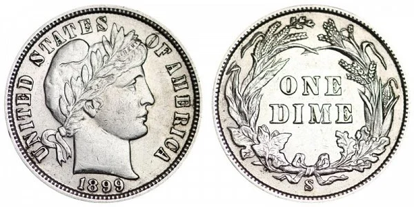 USA Coin Book Estimated Value of 1899-S Barber Dime is Worth $27 in Average Condition and can be Worth $395 to $86 or more in Uncirculated (MS+) Mint Condition. Click here to Learn How to use Coin Price Charts . Also, click here to Learn About Grading Coins . The Melt Value shown below is how Valuable the Coin's Metal is Worth (bare minimum value of coin). Click here to see the Melt Value of every US Coin .