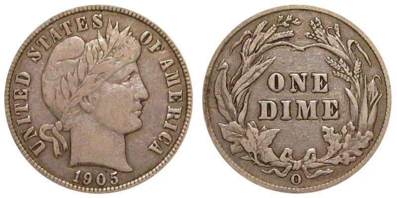 USA Coin Book Estimated Value of 1905-O Barber Dime is Worth $26 in Average Condition and can be Worth $381 to $532 or more in Uncirculated (MS+) Mint Condition. Click here to Learn How to use Coin Price Charts . Also, click here to Learn About Grading Coins . The Melt Value shown below is how Valuable the Coin's Metal is Worth (bare minimum value of coin). Click here to see the Melt Value of every US Coin .