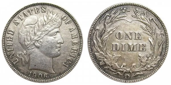 USA Coin Book Estimated Value of 1906-D Barber Dime is Worth $20 in Average Condition and can be Worth $223 to $443 or more in Uncirculated (MS+) Mint Condition. Click here to Learn How to use Coin Price Charts . Also, click here to Learn About Grading Coins . The Melt Value shown below is how Valuable the Coin's Metal is Worth (bare minimum value of coin). Click here to see the Melt Value of every US Coin .