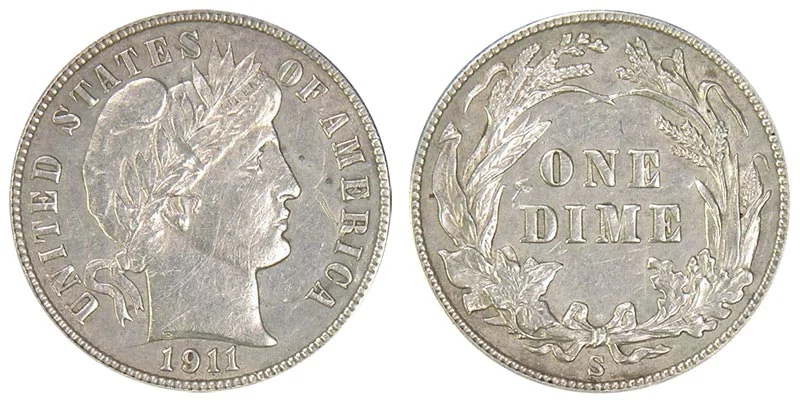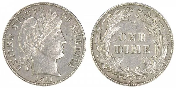 USA Coin Book Estimated Value of 1911-S Barber Dime is Worth $20 in Average Condition and can be Worth $254 to $473 or more in Uncirculated (MS+) Mint Condition. Click here to Learn How to use Coin Price Charts . Also, click here to Learn About Grading Coins . The Melt Value shown below is how Valuable the Coin's Metal is Worth (bare minimum value of coin). Click here to see the Melt Value of every US Coin .