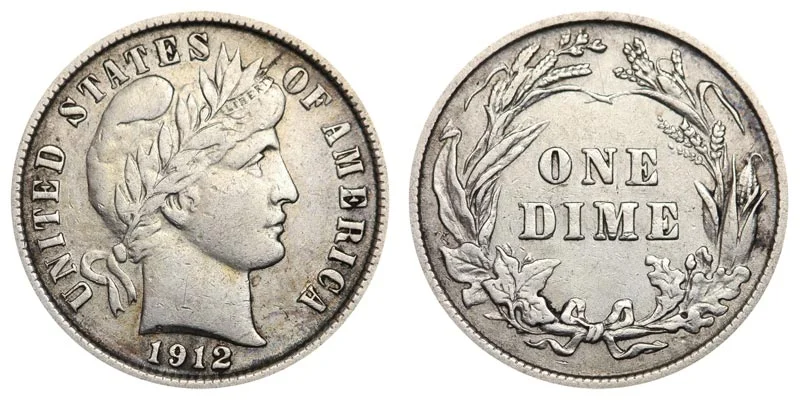 USA Coin Book Estimated Value of 1912 Barber Dime is Worth $15 in Average Condition and can be Worth $167 to $254 or more in Uncirculated (MS+) Mint Condition. Proof Coins can be Worth $617 or more. Click here to Learn How to use Coin Price Charts . Also, click here to Learn About Grading Coins . The Melt Value shown below is how Valuable the Coin's Metal is Worth (bare minimum value of coin). Click here to see the Melt Value of every US Coin .