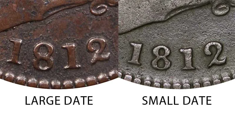 There were two major varieties of the 1812 Classic Head Large Cent (Penny). Both varieties deal with the size of the numbers in the 1812 date on the obverse of the coin. The "Small Date" variety has smaller and shorter numbers while the "Large Date" variety has taller and larger numbers. The size comparison of the numbers and varieties can be seen in the example image of the coins above.