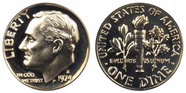 What This Coin Looks Like (Obverse, Reverse, Mint Mark Location, Special Features, etc.): 1974 S Roosevelt Dimes were struck only as Proof coins.