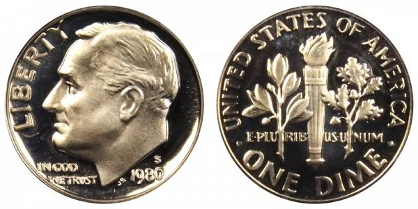 What This Coin Looks Like (Obverse, Reverse, Mint Mark Location, Special Features, etc.): 1980 S Roosevelt Dimes were struck only as Proof coins.