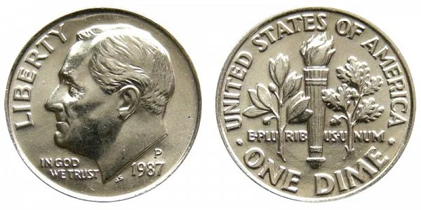 USA Coin Book Estimated Value of 1987-P Roosevelt Dime is Worth $2.79 or more in Uncirculated (MS+) Mint Condition. Click here to Learn How to use Coin Price Charts . Also, click here to Learn About Grading Coins . The Melt Value shown below is how Valuable the Coin's Metal is Worth (bare minimum value of coin). Click here to see the Melt Value of every US Coin .
