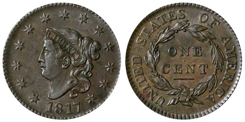 What This Coin Looks Like (Obverse, Reverse, Mint Mark Location, Special Features, etc.): One major variety of the 1817 Coronet Head Large Cent (Penny) is the 13 Stars variety as depicted above. This coin features 13 stars along the rim of the obverse of the coin. The difference between the 1817 13 Stars vs 15 Stars Penny is depicted below in the example comparison image of the coins: