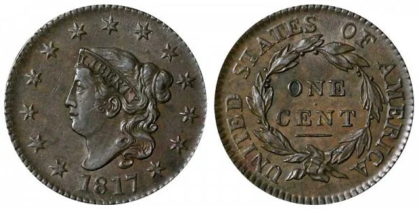 USA Coin Book Estimated Value of 1817 Coronet Liberty Head Large Cent (13 Stars Variety) is Worth $50 in Average Condition and can be Worth $790 to $1,243 or more in Uncirculated (MS+) Mint Condition. Click here to Learn How to use Coin Price Charts . Also, click here to Learn About Grading Coins . The Melt Value shown below is how Valuable the Coin's Metal is Worth (bare minimum value of coin). Click here to see the Melt Value of every US Coin .
