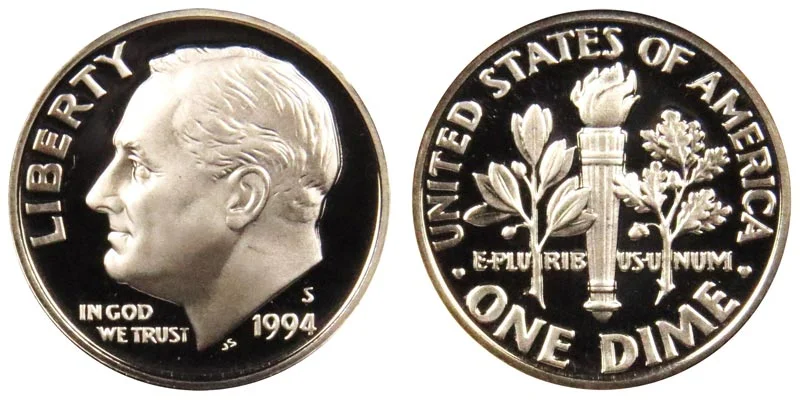 What This Coin Looks Like (Obverse, Reverse, Mint Mark Location, Special Features, etc.): 1994 S Silver Roosevelt Dimes were struck only as Proof coins.