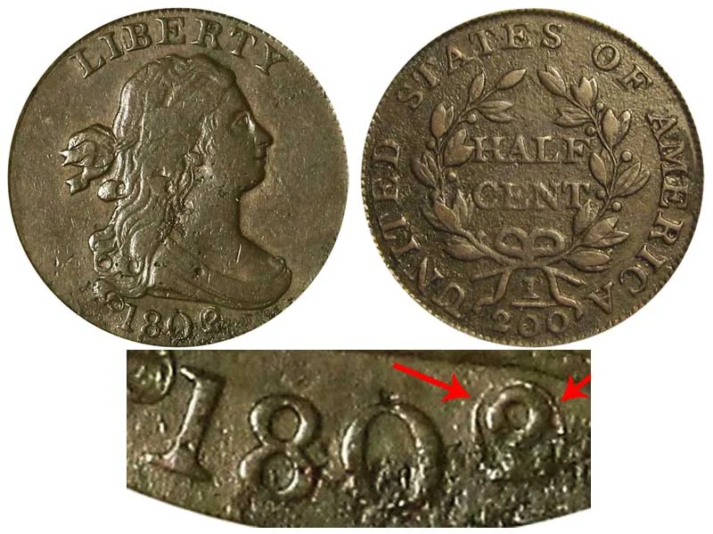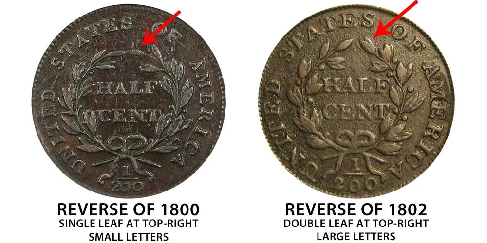 One major variety includes the 1802/0 Draped Bust Half Cent (Penny) which features the reverse design of 1802. First of all: This is an overdate error with an 1802 date struck over an 1800 date which resulted in the underlying "0" being seen completely around the number "2". This coin also features the newer design on the reverse of the coin. The best way to identify this variety is to note the larger letters and that there is a double leaf on the top of the right-side branch whereas the 1800 reverse only has one single leaf. The difference between the reverse of 1800 vs reverse of 1802 is depicted below in the example comparison image of the coins: