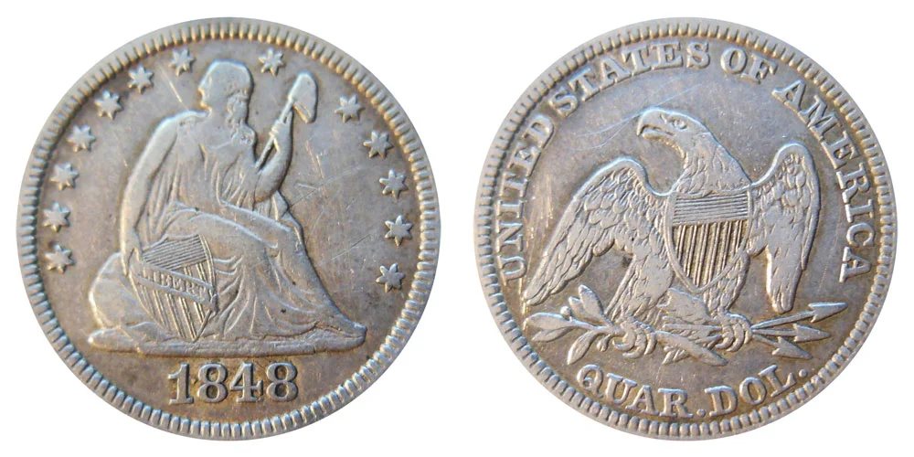 USA Coin Book Estimated Value of 1848 Seated Liberty Quarter is Worth $131 in Average Condition and can be Worth $1,535 to $5,732 or more in Uncirculated (MS+) Mint Condition. Click here to Learn How to use Coin Price Charts . Also, click here to Learn About Grading Coins . The Melt Value shown below is how Valuable the Coin's Metal is Worth (bare minimum value of coin). Click here to see the Melt Value of every US Coin .