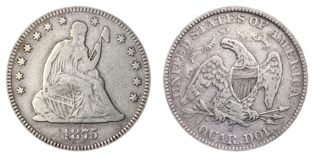 USA Coin Book Estimated Value of 1875-S Seated Liberty Quarter is Worth $86 in Average Condition and can be Worth $734 to $1,357 or more in Uncirculated (MS+) Mint Condition. Click here to Learn How to use Coin Price Charts . Also, click here to Learn About Grading Coins . The Melt Value shown below is how Valuable the Coin's Metal is Worth (bare minimum value of coin). Click here to see the Melt Value of every US Coin .