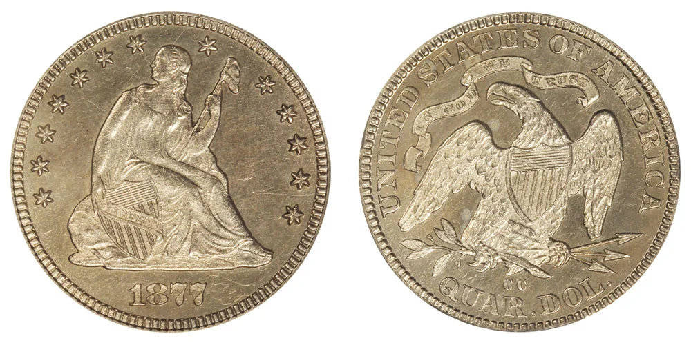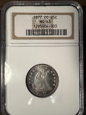 USA Coin Book Estimated Value of 1877-CC Seated Liberty Quarter is Worth $125 in Average Condition and can be Worth $652 to $1,457 or more in Uncirculated (MS+) Mint Condition. Click here to Learn How to use Coin Price Charts . Also, click here to Learn About Grading Coins . The Melt Value shown below is how Valuable the Coin's Metal is Worth (bare minimum value of coin). Click here to see the Melt Value of every US Coin .