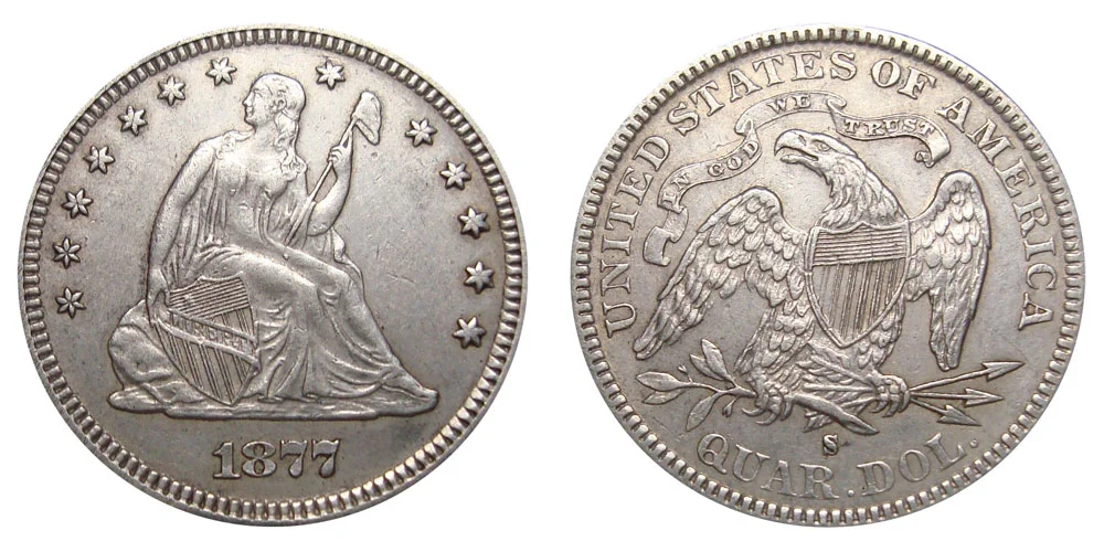 USA Coin Book Estimated Value of 1877-S Seated Liberty Quarter is Worth $55 in Average Condition and can be Worth $357 to $678 or more in Uncirculated (MS+) Mint Condition. Click here to Learn How to use Coin Price Charts . Also, click here to Learn About Grading Coins . The Melt Value shown below is how Valuable the Coin's Metal is Worth (bare minimum value of coin). Click here to see the Melt Value of every US Coin .