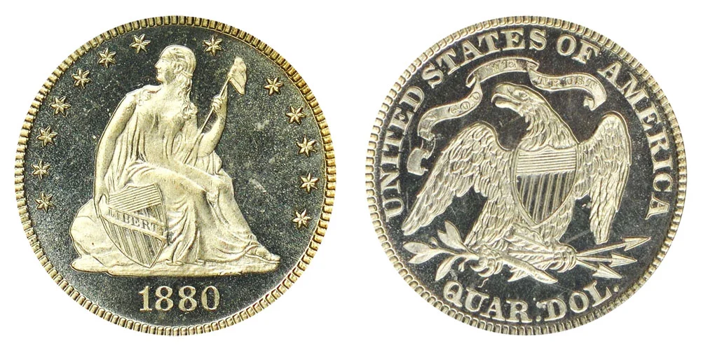 USA Coin Book Estimated Value of 1880 Seated Liberty Quarter is Worth $357 in Average Condition and can be Worth $838 to $1,076 or more in Uncirculated (MS+) Mint Condition. Proof Coins can be Worth $942 or more. Click here to Learn How to use Coin Price Charts . Also, click here to Learn About Grading Coins . The Melt Value shown below is how Valuable the Coin's Metal is Worth (bare minimum value of coin). Click here to see the Melt Value of every US Coin .