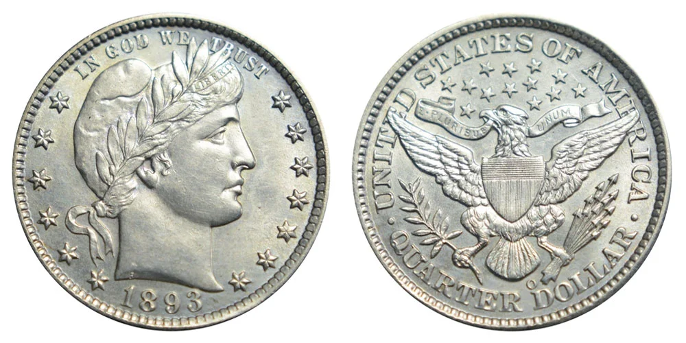 USA Coin Book Estimated Value of 1893-O Barber Quarter is Worth $31 in Average Condition and can be Worth $389 to $604 or more in Uncirculated (MS+) Mint Condition. Click here to Learn How to use Coin Price Charts . Also, click here to Learn About Grading Coins . The Melt Value shown below is how Valuable the Coin's Metal is Worth (bare minimum value of coin). Click here to see the Melt Value of every US Coin .