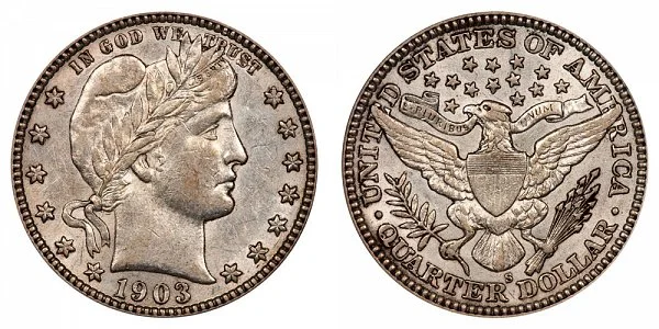 USA Coin Book Estimated Value of 1903-S Barber Quarter is Worth $42 in Average Condition and can be Worth $733 to $1,256 or more in Uncirculated (MS+) Mint Condition. Click here to Learn How to use Coin Price Charts . Also, click here to Learn About Grading Coins . The Melt Value shown below is how Valuable the Coin's Metal is Worth (bare minimum value of coin). Click here to see the Melt Value of every US Coin .