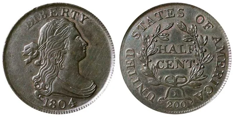 A major variety of the 1804 Draped Bust Half Cent (Penny) features a combination of a plain "4" within the 1804 date on the obverse of the coin and no stems (stemless) on the wreath on the reverse of the coin as depicted above.