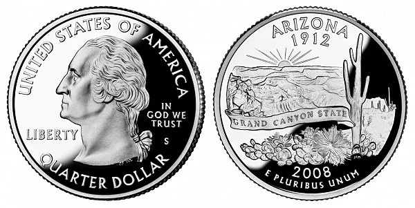 USA Coin Book Estimated Value of 2008-S Arizona 50 States and Territories Quarter (Silver Proof Variety) is Worth $27 or more. Click here to Learn How to use Coin Price Charts . Also, click here to Learn About Grading Coins . The Melt Value shown below is how Valuable the Coin's Metal is Worth (bare minimum value of coin). Click here to see the Melt Value of every US Coin .