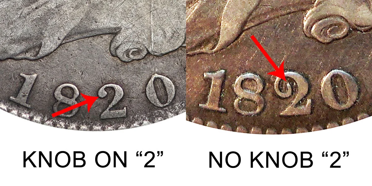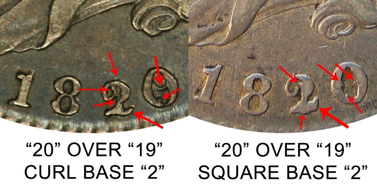 The next major variety features a normal 1820 date with three sub-varieties dealing with the style of the number "2" in the date. The first variety is the curl base "2" which again features a curled and curved base to the number "2". This variety always features a small date and no knob on the "2". The other two varieties feature a square base "2" with a flat and square base. The square base 2 variety always has a large date but has two sub-varieties as well - One variety features a knob on the upper tip of the "2" while the other variety as no knob and instead curls around and up. The difference between these varieties and sub-varieties is depicted below starting with the square base 2 vs curl base 2: