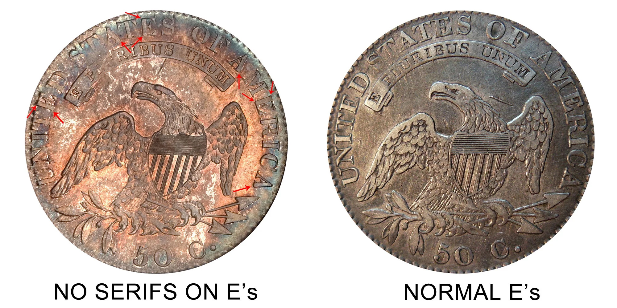 The last major variety deals with the reverse of the coin and features no serifs at the top and bottoms on the back of the letter E's in the words "UNITED STATES OF AMERICA". In addition: The letter A's also have a defect in that the bottom-right foot of the "A" is missing - so this is another easy way to identify this variety. The difference between the "No serifs on E's" reverse vs Normal reverse is depicted below in the example image: