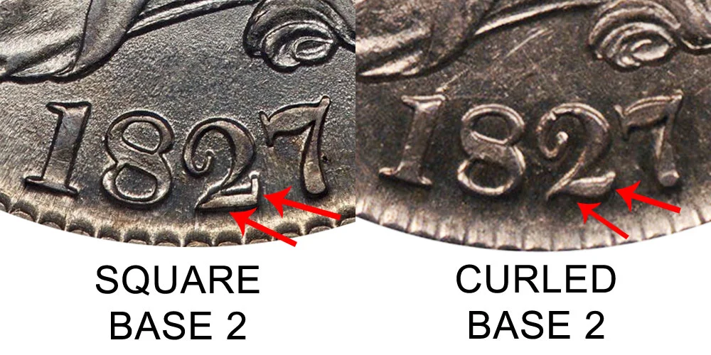What This Coin Looks Like (Obverse, Reverse, Mint Mark Location, Special Features, etc.): One major variety of the 1827 Capped Bust Half Dollar features a square base on the number "2" in the 1827 date. The base is flat and comes up at a square angle at the end - unlike the curled and curved base 2 variety. The difference between the Square Base 2 vs Curled Base 2 varieties is depicted below in the example comparison image:
